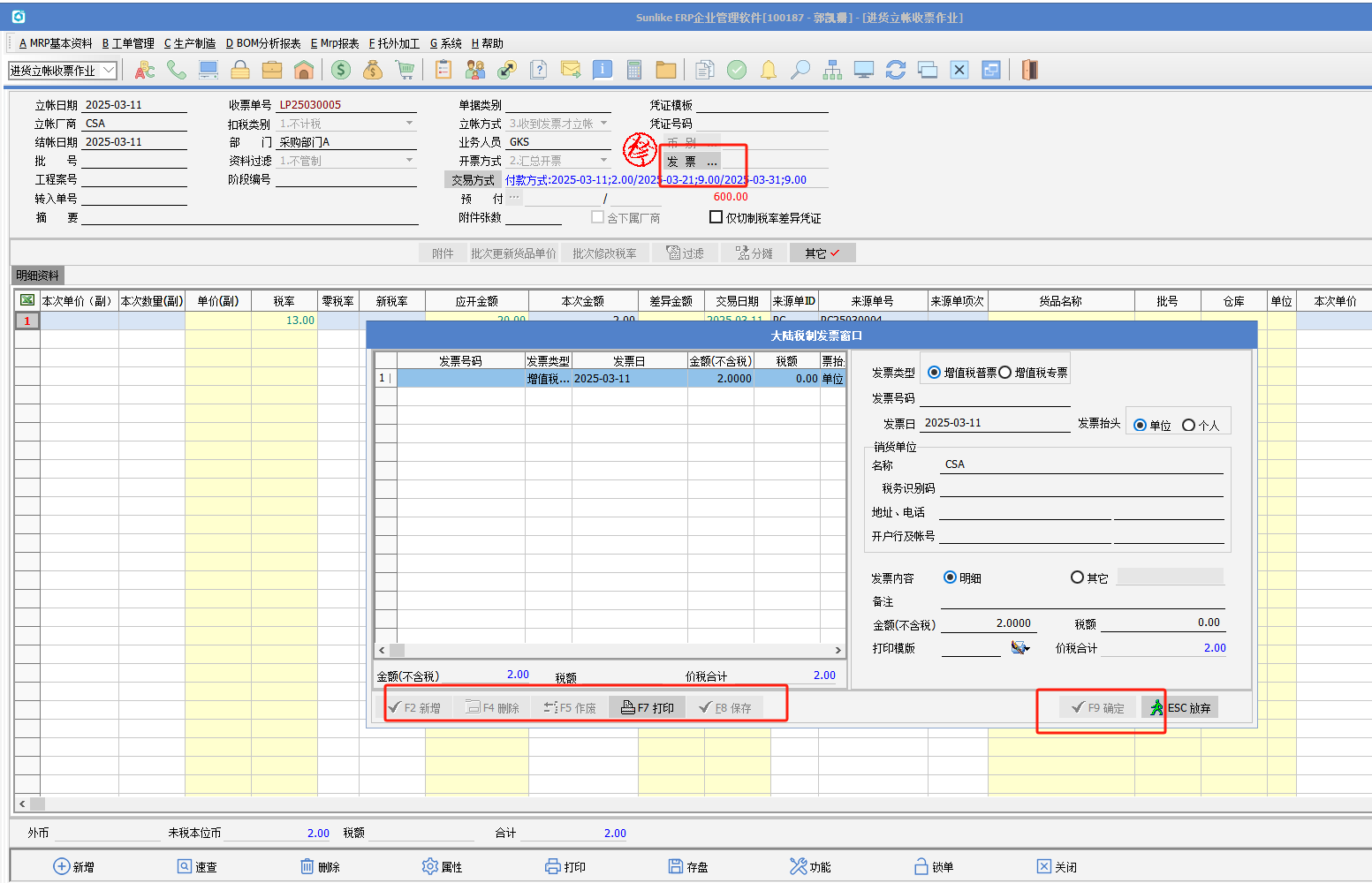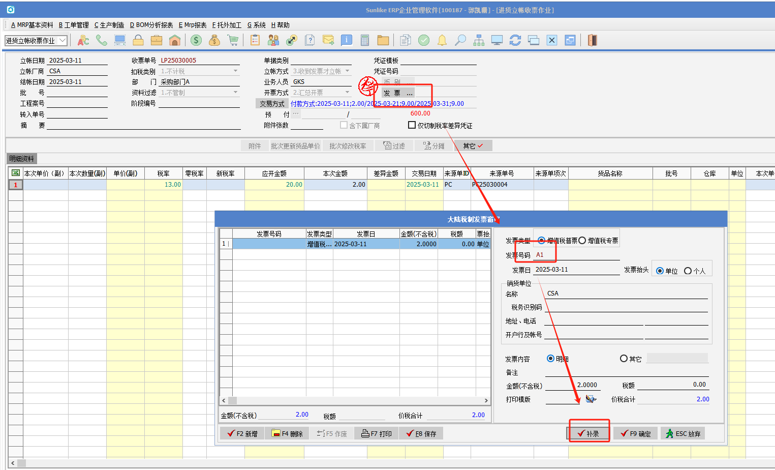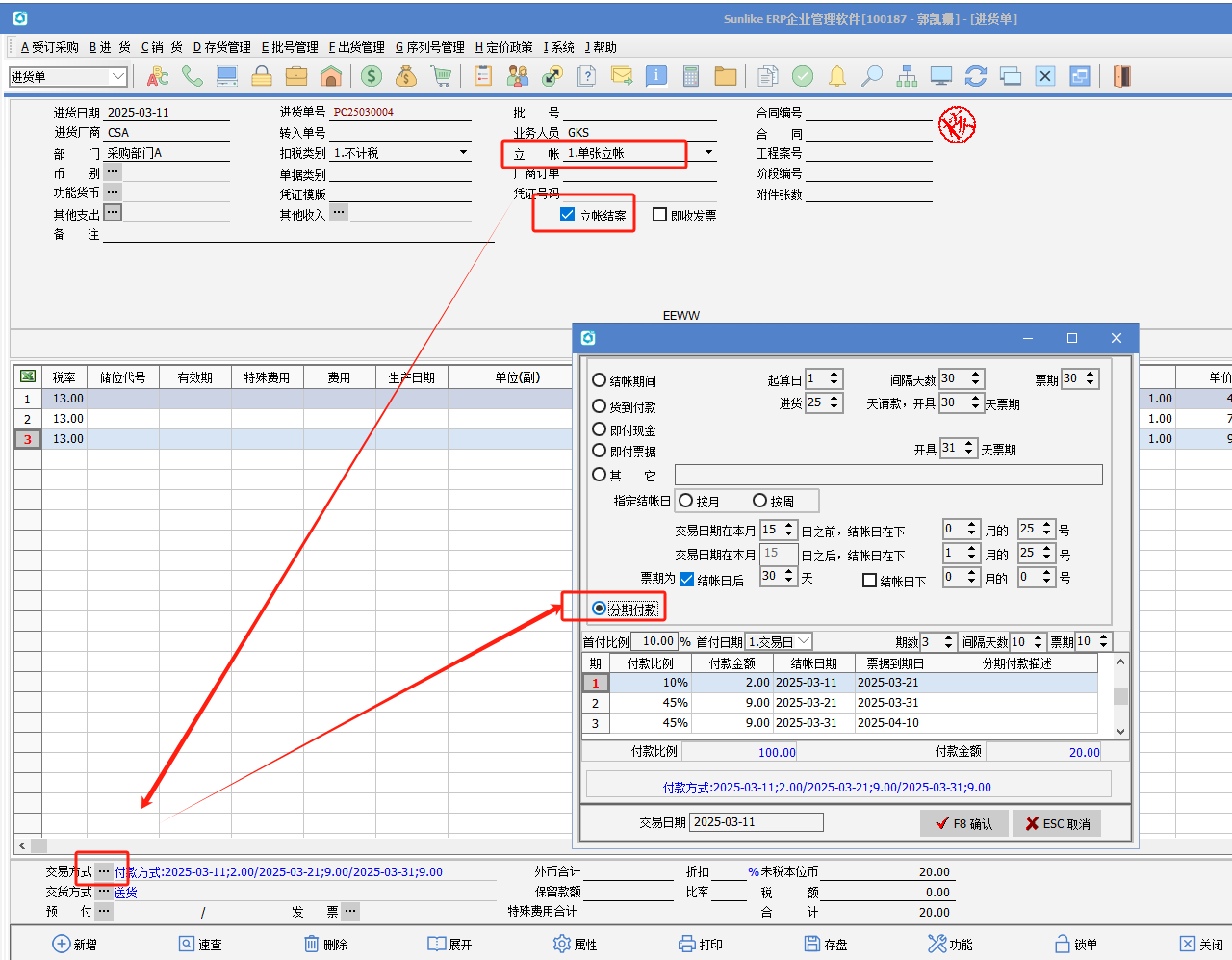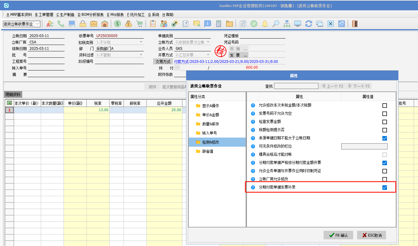 (3)進貨立賬收票作業勾選屬性“分期付款單據發票補錄”
