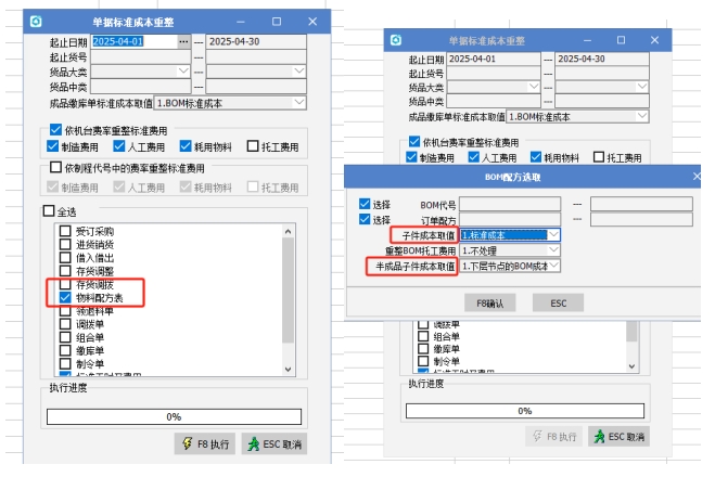 (2)做單據(jù)標(biāo)準(zhǔn)成本重整,勾選“物料配方表”,重整BOM的成本,子件成本取值和半成品子件成本取值可以依據(jù)屬性取標(biāo)準(zhǔn)成本或BOM成本。