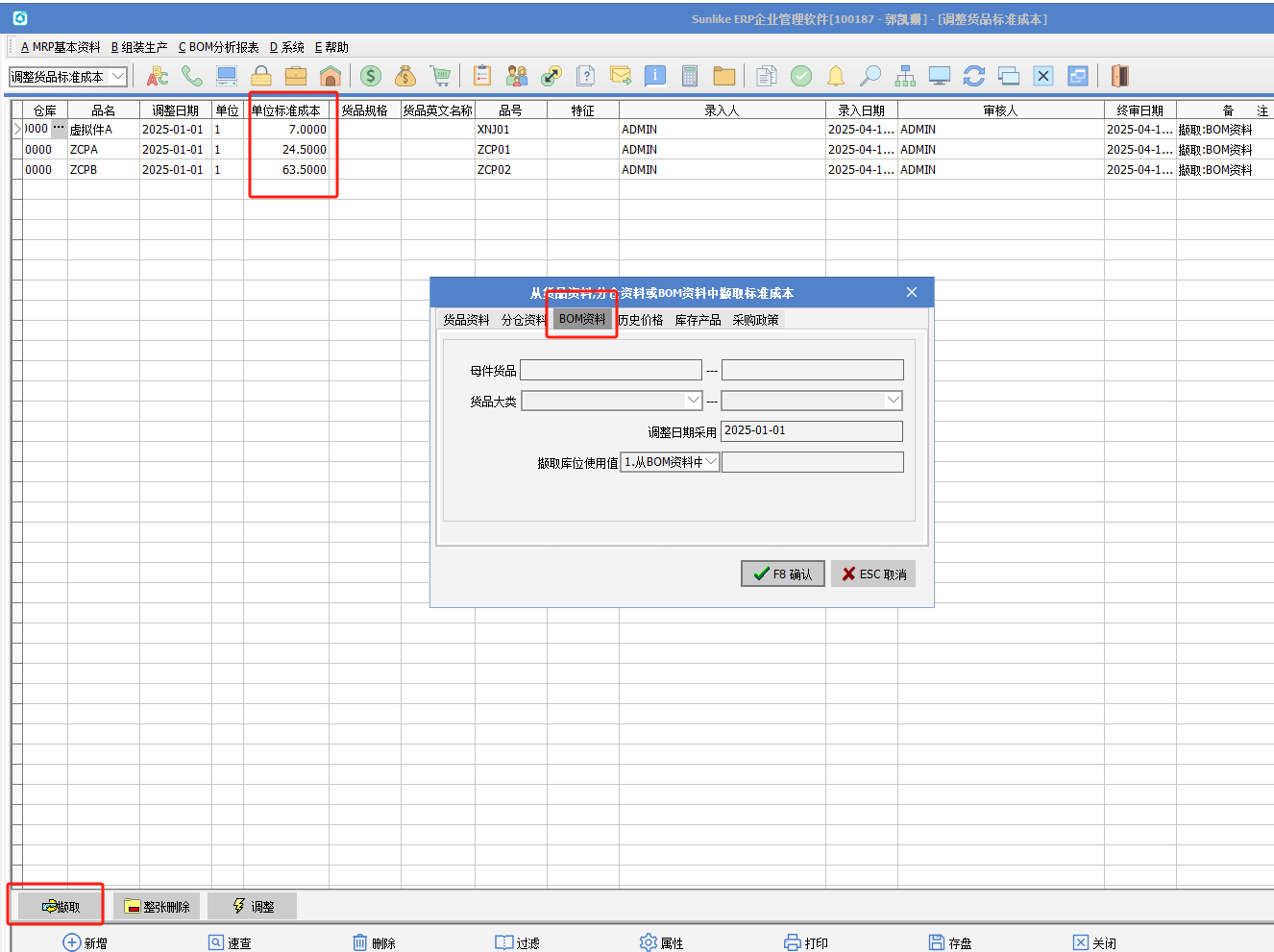 3.將標(biāo)準(zhǔn)配方BOM的母件貨品的成本寫入到貨品標(biāo)準(zhǔn)成本 擷取按鈕--選擇BOM資料--點(diǎn)擊確認(rèn)按鈕后,會將標(biāo)準(zhǔn)配方BOM的母件貨品的生產(chǎn)成本寫入調(diào)整貨品標(biāo)準(zhǔn)成本。