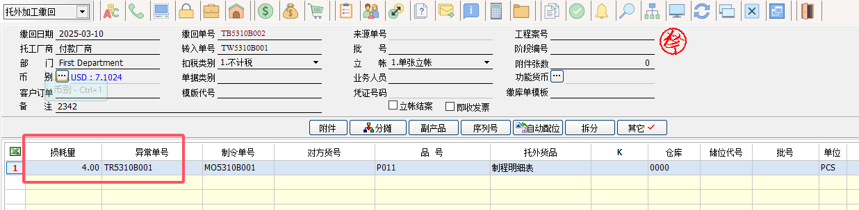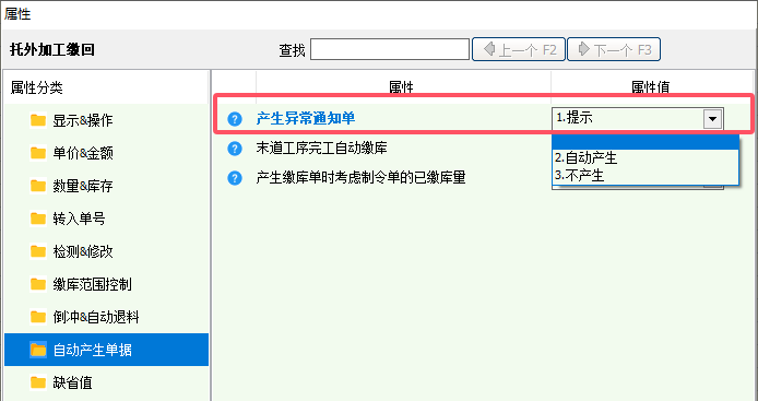 以前我們走制程托外加工單進行繳回,如果我們貨品有損壞,并且需要繳庫的時候,就必須走檢驗流程,檢驗不合格轉異常通知單繳庫處理。但是如果我們沒有走檢驗流程,就只能按正常貨品托工繳庫,需要走完后續工序后繳庫。流程上比較繁瑣。 現在托外加工繳回單增加屬性“產生異常通知單”存盤時,根據表身托工單號是制程托工記錄按屬性“產生異常通知單”來進行處理。 做單的時候,屬性選擇提示或者自動產生,單據的損耗量欄位輸入異常的數量,存盤后會產生異常通知單,后續通過異常通知單轉繳庫處理產生繳庫。這樣減少了操作,大大簡便了流程。(如下圖)