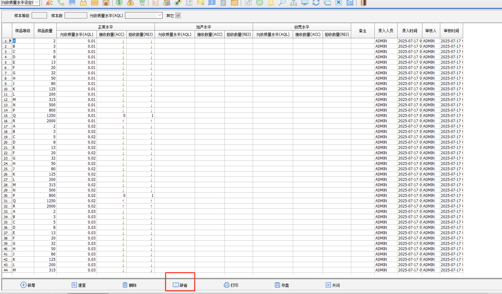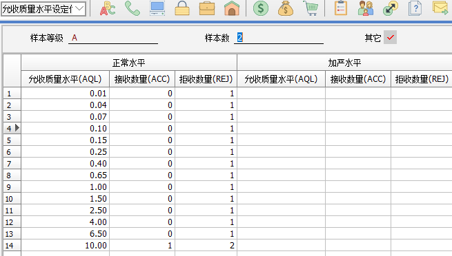 2. 允許質(zhì)量水平設(shè)定:點擊缺省,將載入最新的標(biāo)準(zhǔn)檔數(shù)據(jù)。 原來做法:允許質(zhì)量水平(AQL)對應(yīng)的接收數(shù)量(ACC)和拒收數(shù)量(REJ)是一一對應(yīng)的數(shù)值。