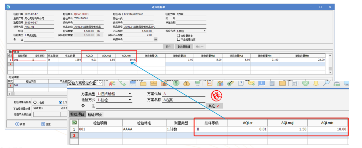 3.3 進貨檢驗單: 表頭轉(zhuǎn)入進貨送檢單: A、表頭根據(jù)送檢品號帶出【貨品檢驗方案設(shè)定作業(yè)】設(shè)定的方案。 B、根據(jù)方案,將檢驗項目、抽樣等級,AQLcr、AQLmaj、AQLmin的值帶到表身抽樣信息窗口。