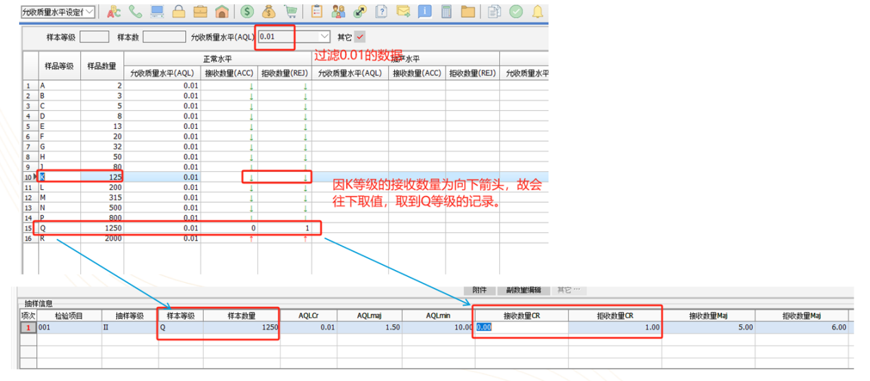 2.現(xiàn)在做法:允許質(zhì)量水平(AQL)對應(yīng)的接收數(shù)量(ACC)和拒收數(shù)量(REJ)為浮動機制,可以錄入向下箭頭或向上箭頭。后續(xù)的檢驗單,根據(jù)驗貨數(shù)量和抽樣等級到檢驗批量/檢驗等級去取對應(yīng)的樣本等級,再根據(jù)該樣本等級和 AQLCr到允收質(zhì)量水平取值,如果為↑,則表示向上取值,直到取到具體的數(shù)字;如果是↓,則表示向下取值,直到取到具體的數(shù)字,根據(jù)該數(shù)字,再取該行對應(yīng)的樣本等級和樣本數(shù)量。