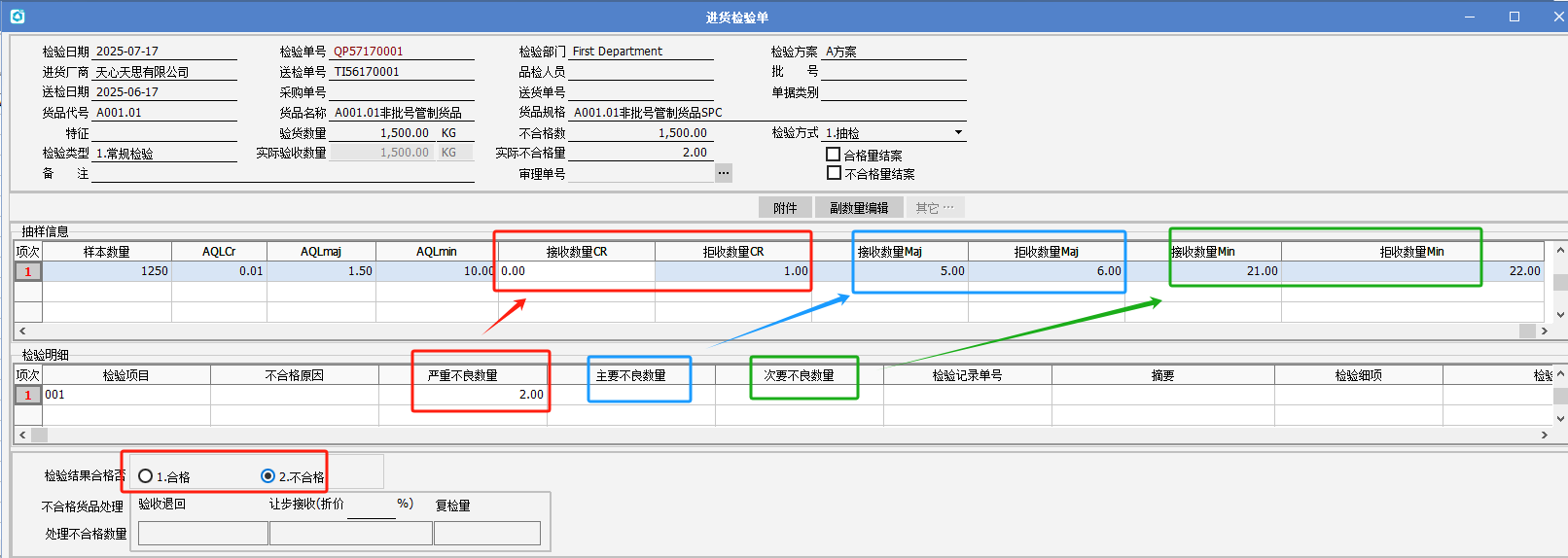 注意:當(dāng)送檢量小于樣品數(shù)量,進貨送檢單的樣本數(shù)量就取送檢量,若大于樣本數(shù)量,就取樣品數(shù)量。 E、再錄入檢驗明細的不良數(shù)量,即可判定檢驗結(jié)果是否合格。根據(jù)下圖的不良數(shù)量對應(yīng)接收數(shù)量和拒收數(shù)量范圍來判定是否合格。最后單據(jù)保存即可。