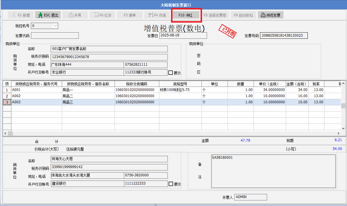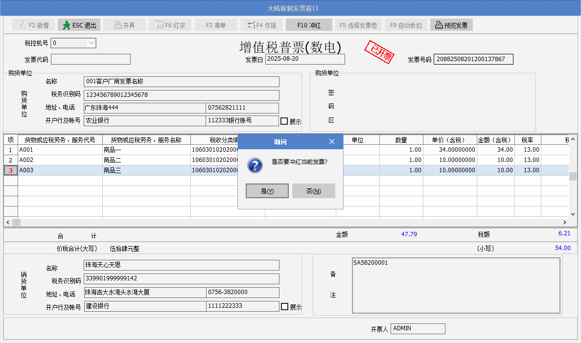 2. 舉例說明:銷貨單開出了增值稅發票后,需要做沖紅,點發票窗口的F10沖紅按鈕,彈出提示“是否要沖紅當前發票?”