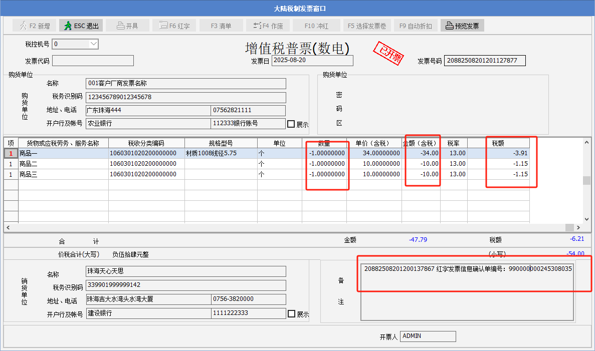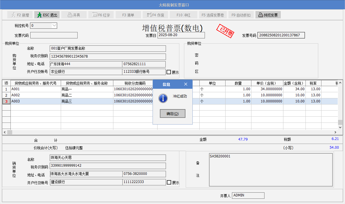 4. 彈出提示“沖紅成功”,點確定。Sunlike通過諾諾網接口獲取到沖紅發票號碼,備注中列示--紅字發票信息確認單編號,表身的數量以及金額欄位顯示為負數。