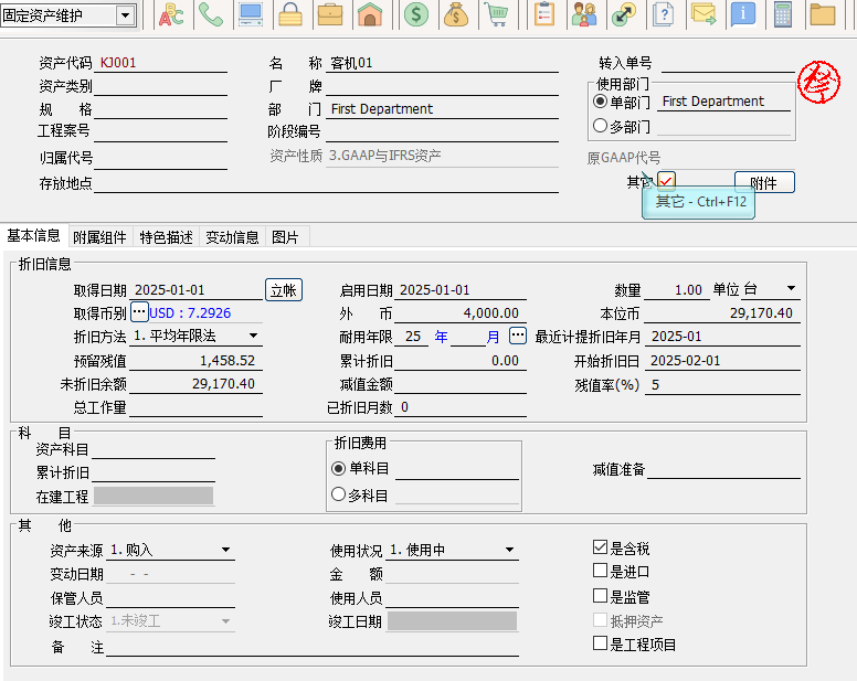 需求:企業的大型固定資產進行功能改良過程,會購入新的配件(配件的性質也是固定資產價值高),該配件按常規的固定資產進行日常折讓、報廢、減值、停用、改變歸屬資產處理。希望但在報表(財產目錄、折舊提列統計表、固定資產折舊情況表)可以選擇查看大型固定資產的總價值。 用戶是走固定資產采購流程,采購入庫后產生新的固定資產。用固定資產變動將配件與主資產進行綁定,各種報表查詢按需查詢即可。以下以客機和渦輪葉片為例: