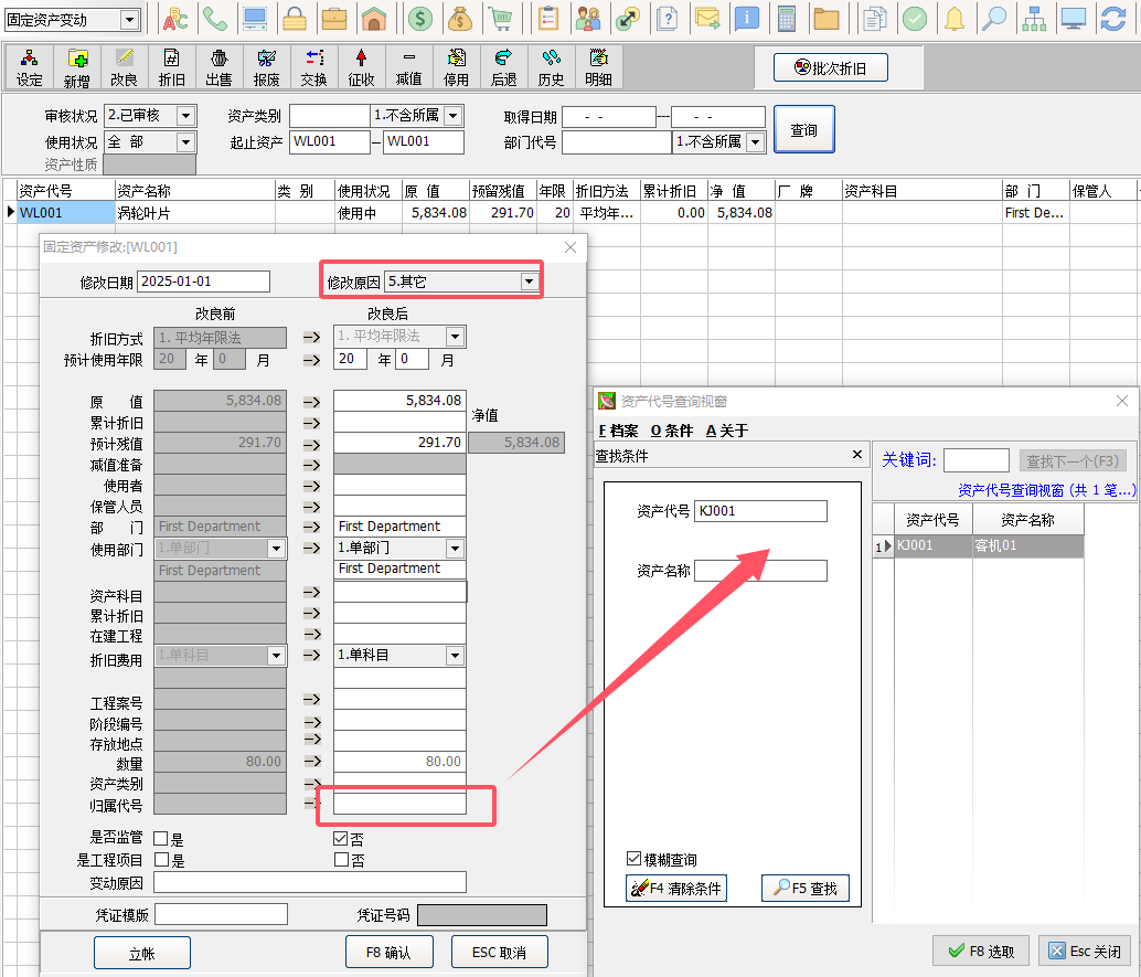 新增完畢后,在固定資產變動中過濾出配件部分選擇改良-其它,將配件歸屬代號選擇主固定資產即可