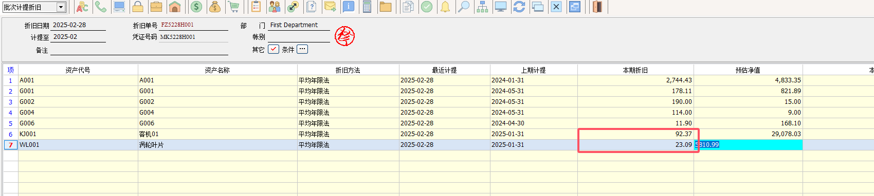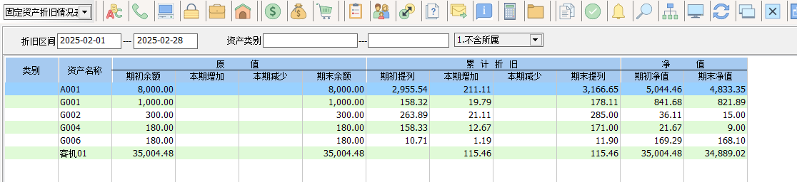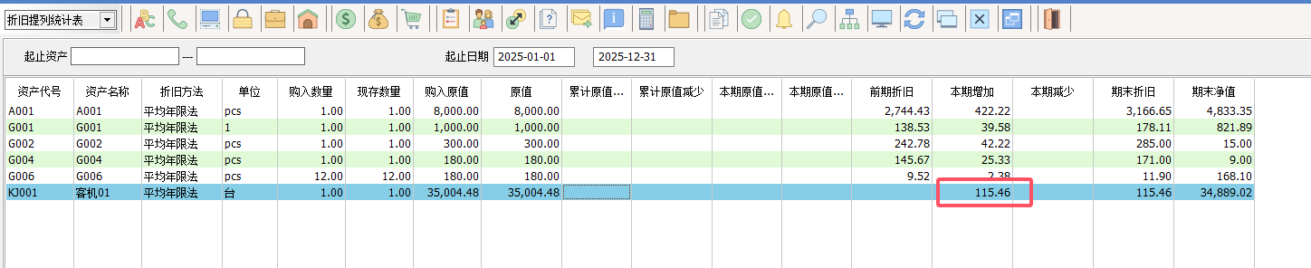 報表財產目錄、折舊提列統計表、固定資產折舊情況表都增加的條件資產列示含所屬來包含配件的金額。